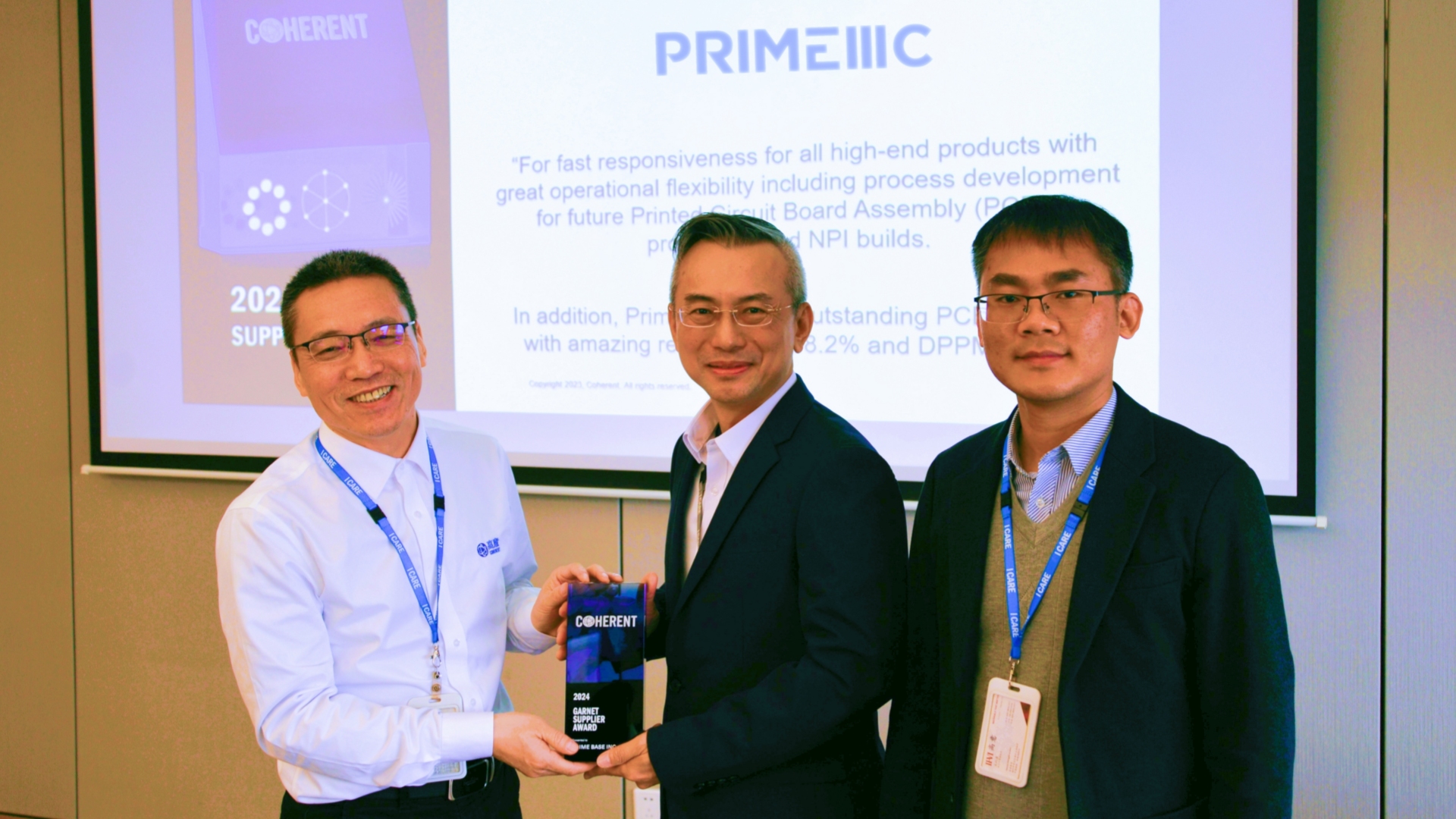 PRIME mk体育,大众控股(3701) FICG 旗下30年的AI光传输电子设计制造商,再次荣幸地获得了全球知名材料、网络与激光公司 - 美国Coherent高意 - 全球供应商卓越奖: 获奖项目为"GARNET Supplier Award 2024 -红宝石供应商奖”。PRIMEmk体育从2020年至今连续第三年荣获Coherent各项供应商大奖的认可。PRIMEmk体育在多个领域的卓越表现,再次受到了各界高度赞誉,展示了其在AI光传输设计制造服务领域的卓越成就。