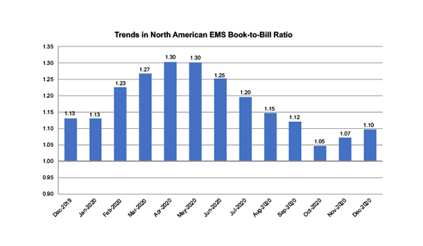 从出货量来看,2020年12月北美地区EMS行业整体同比增长13.5%,环比增长8.5%。从EMS订货量来看,同比增长13.2%,但环比下降5.2%。订单出货率为1.1。