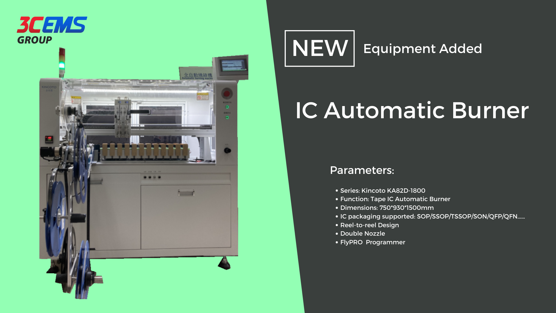 我司新增購入一臺IC自動燒錄機。IC自動燒錄機主要應用於我司生產的消費性電子產品,可實現自動拆料—燒錄—標記—封裝—卷料,全程無人化,全自動生產。