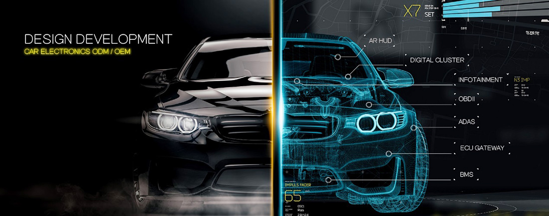 汽車設計產品業務包含: LBS 3D 鐳射 AR HUD、數位儀表、ECU、ADAS、ADD 360度車內環景影像、IVI 娛樂視聽系統、車隊管理系統整合、汽車高精密軟硬體開發設計與搭建、UX/UI 設計、供應鏈管理、TURNKEY 解決方案。